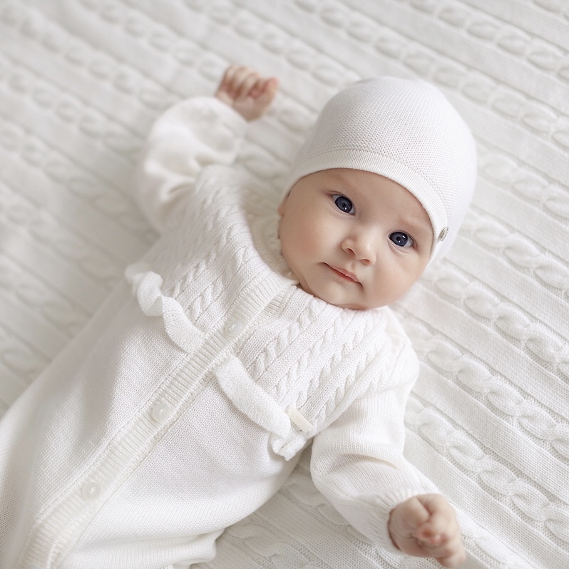 Шапочка прекрасно сочетается с другой одеждой из мериносовой шерсти: комбинезоном с рюшами или косами, пинетками и пледами.